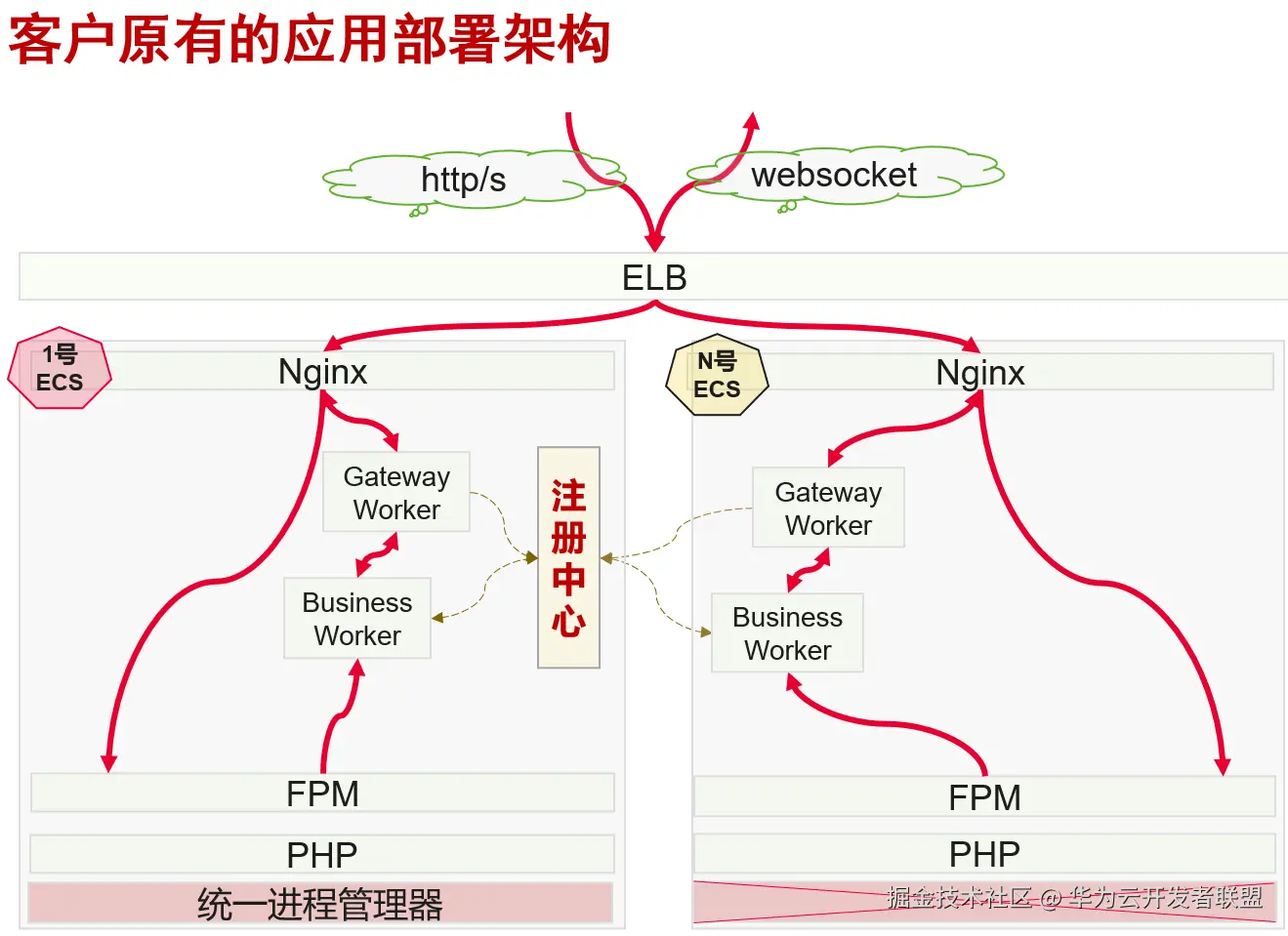 图为客户应用部署架构,从应用部署角度来看,1号服务器属于有状态部署,不支持伸缩,有额外的注册中心,所有的网关节点和业务节点必须向其注册自身,存在单点故障的风险。
