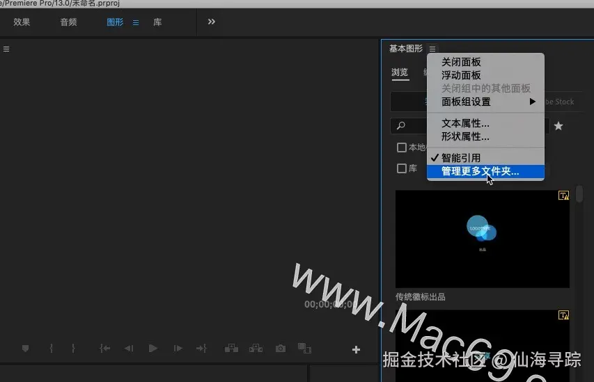 3、打开Pr软件,选择基本图形,点击管理更多文件夹。