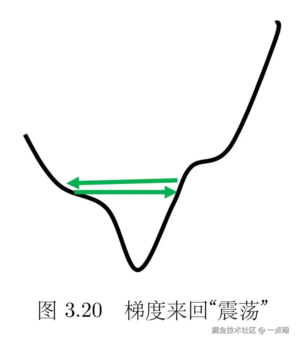 ② 若梯度不断来回“震荡”,虽然损失不再下降,但梯度并没有变得很小,大概就是说损失可以下降但步伐太大走不进谷底。