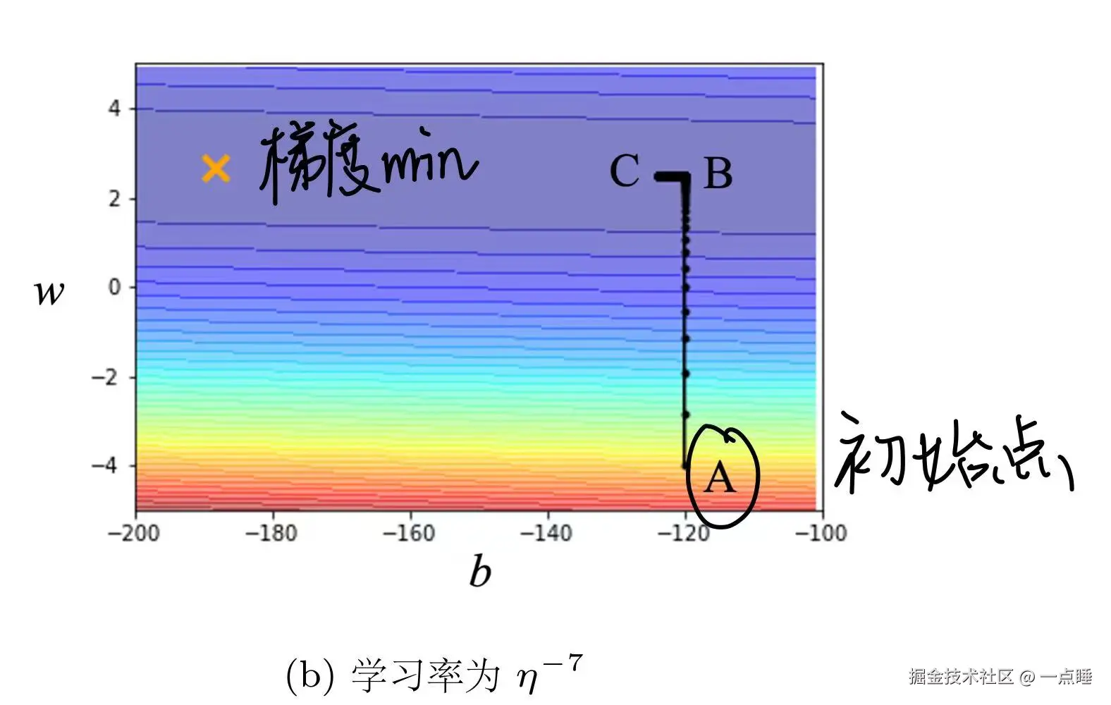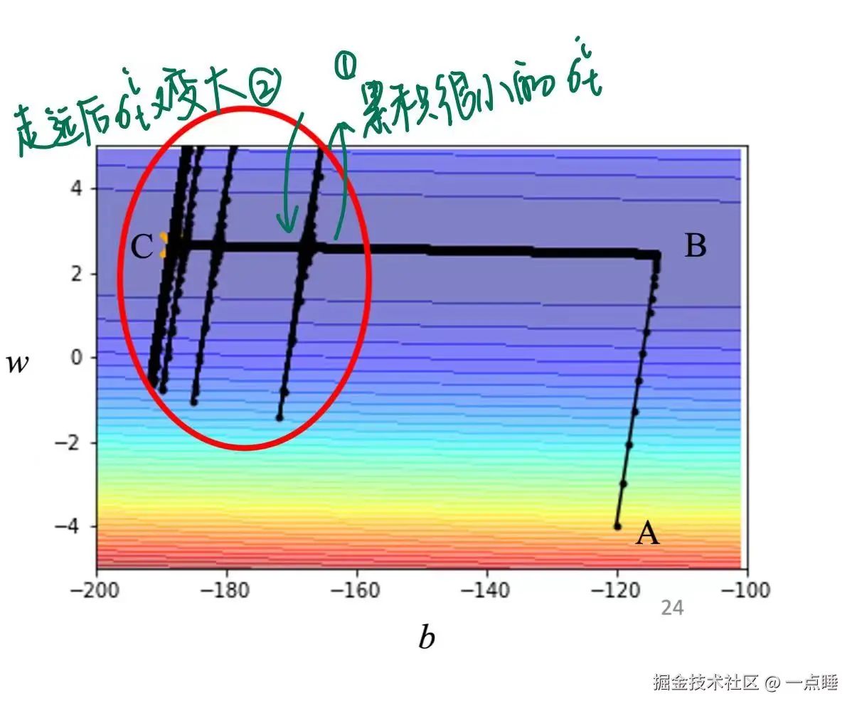 ③ 或者,B→C 梯度平缓,学习率太小导致下降不动了。