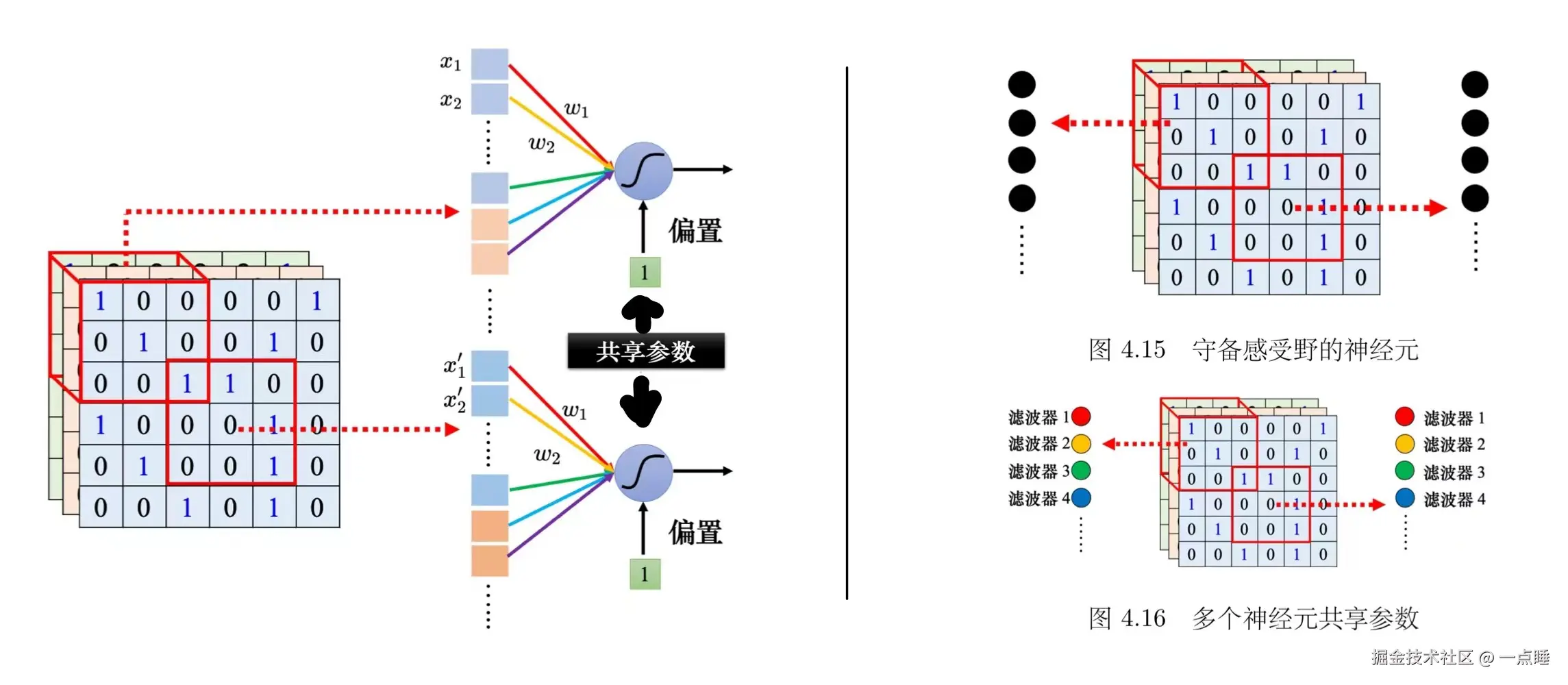 - 减少参数(CNN是一种比较没有灵活性的模型,感受野、滤波器、汇聚等都在施加约束)