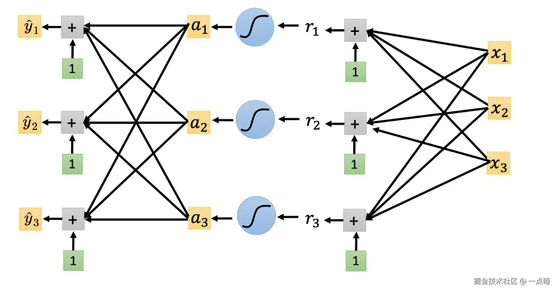 把回归中输出一个数值的方法,重复三次()。即:把a1、a2、a3乘上三个不同的权重,加上偏置,得到 ;再分别乘上另外三个权重,加上另一个偏置,得到 ;...