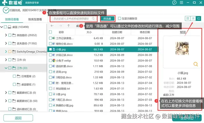 步骤2: 在扫描结果里选择需要恢复的文件,可以通过上方的搜索框输入文件名直接快速找到目标文件,也可以选择“筛选器”功能去给文件进行小范围的限定筛选,更快找到目标文件。