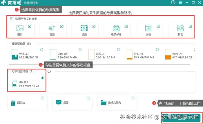 步骤1: 下载安装数据 蛙恢复专家这款软件,打开首页选择需要恢复的数据类型和需要进行文件找回的移动磁盘,最后点“扫描”。