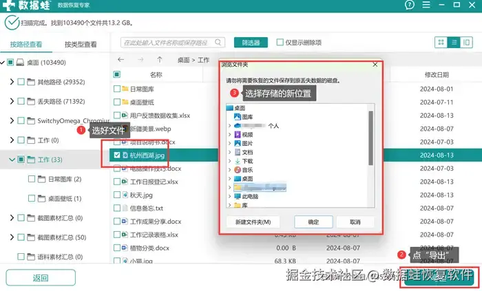 步骤3: 选中目标文件后,点击“导出”,最后在“浏览文件夹”里选择恢复文件的存放位置。