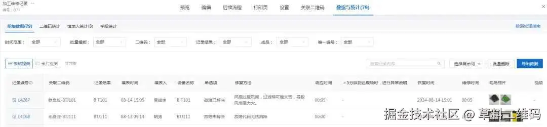 数据后台导出分析:针对数据,可进行导出,进行排序分析,形成设备稼动率报表。 草料二维码后台数据