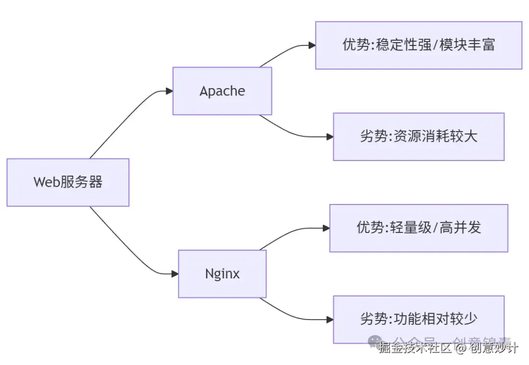 虽然 Apache 是世界上最流行的 HTTP 服务器之一,但它并不是市场上唯一的选择。与 Apache 竞争的主要有 Nginx、Microsoft 的 IIS 以及 Google 的 GWS 等。其中,Nginx 近年来因其高性能和低内存占用率而受到广泛关注。我们可以把 Apache 和 Nginx 比作两位厨师:Apache 擅长多样化的菜单和复杂的菜品,而 Nginx 则以速度和高效著称,擅长快餐和简餐。
