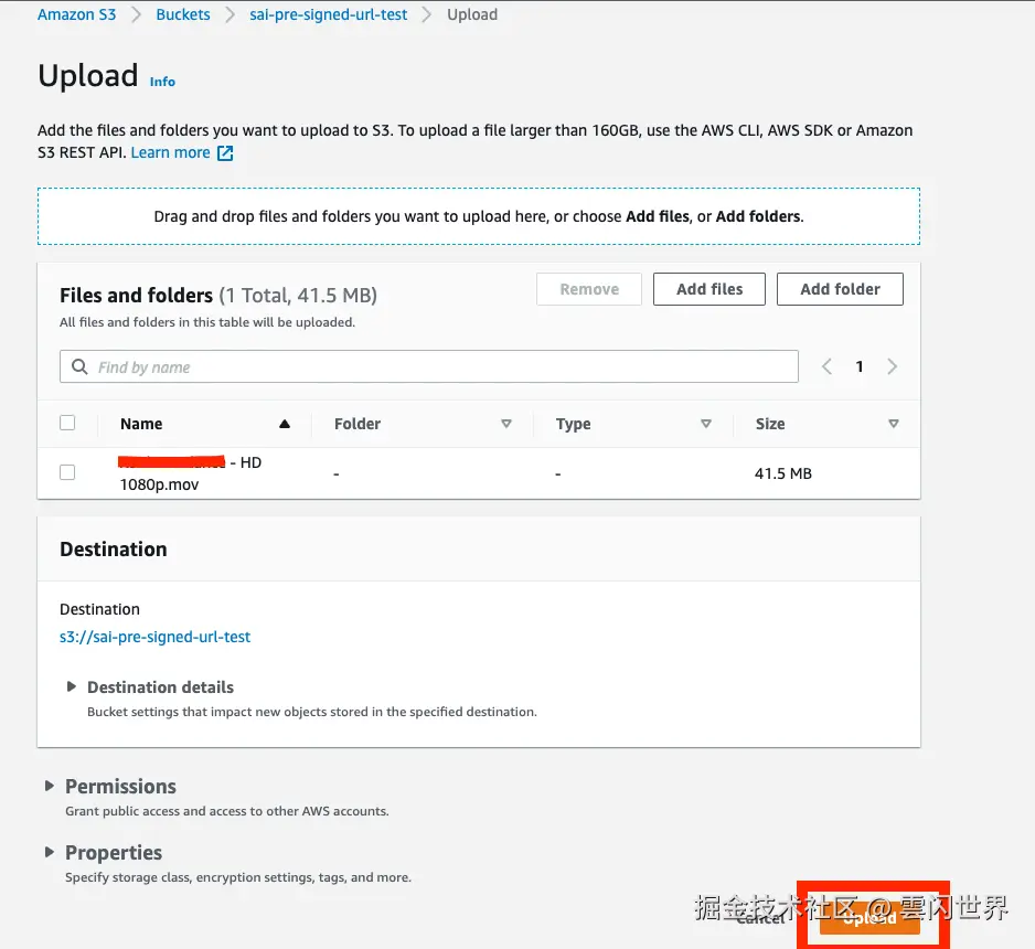 - 将随机对象从本地计算机拖放到存储桶,然后单击上传。