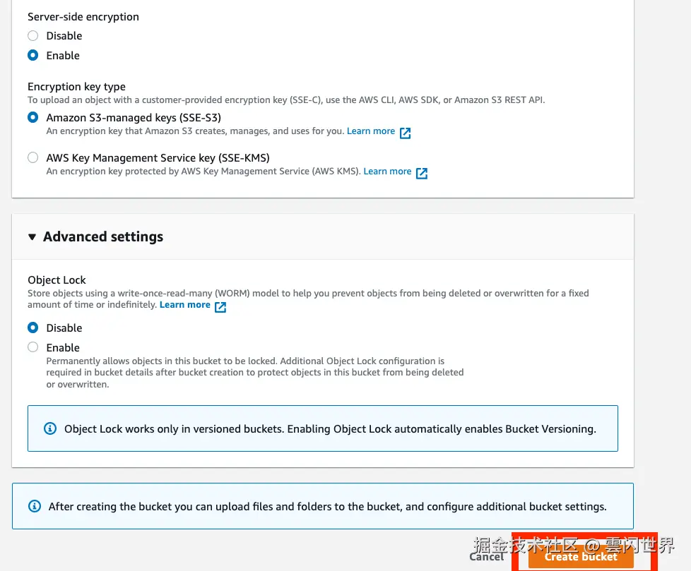 默认加密: 单击“启用”并选择您的加密类型。常见选择 - Amazon S3 托管密钥 (SSE-S3)