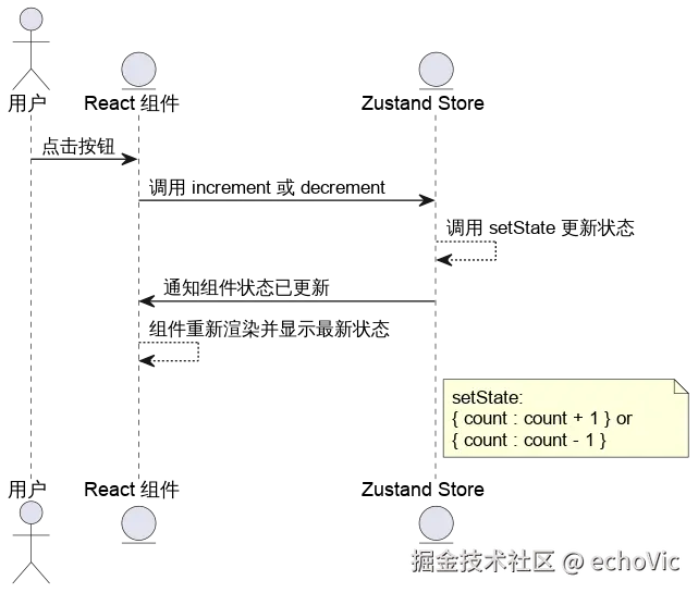 一旦状态更新,所有通过 subscribe 方法订阅了状态变化的监听器都会被调用,React 组件通过 useStore 再次获取最新的状态,并触发重新渲染以显示更新后的值。