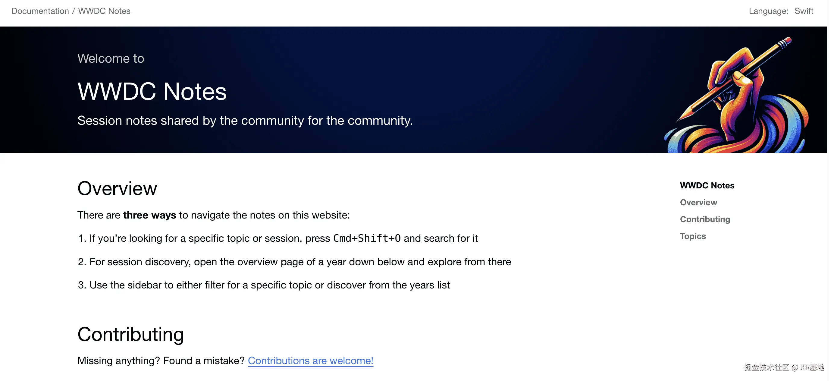整个 WWDC Notes 网站都是基于 Apple 的 Swift-Doc 生成的,并且整个笔记的内容都是开源社区维护的。如果你对这个项目感兴趣,也可以 点击这里 给这个项目贡献一份力量。