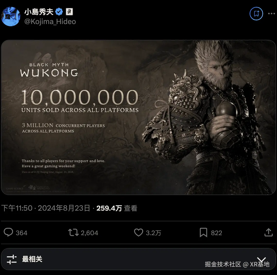 这一周,不管你是不是一个游戏玩家,相信你的各种时间线都会被《黑神话·悟空》所占据。不止如此,在游戏行业拥有崇高地位的制作人小岛秀夫都在黑神话售出 1000 万份之时发了一条帖子: