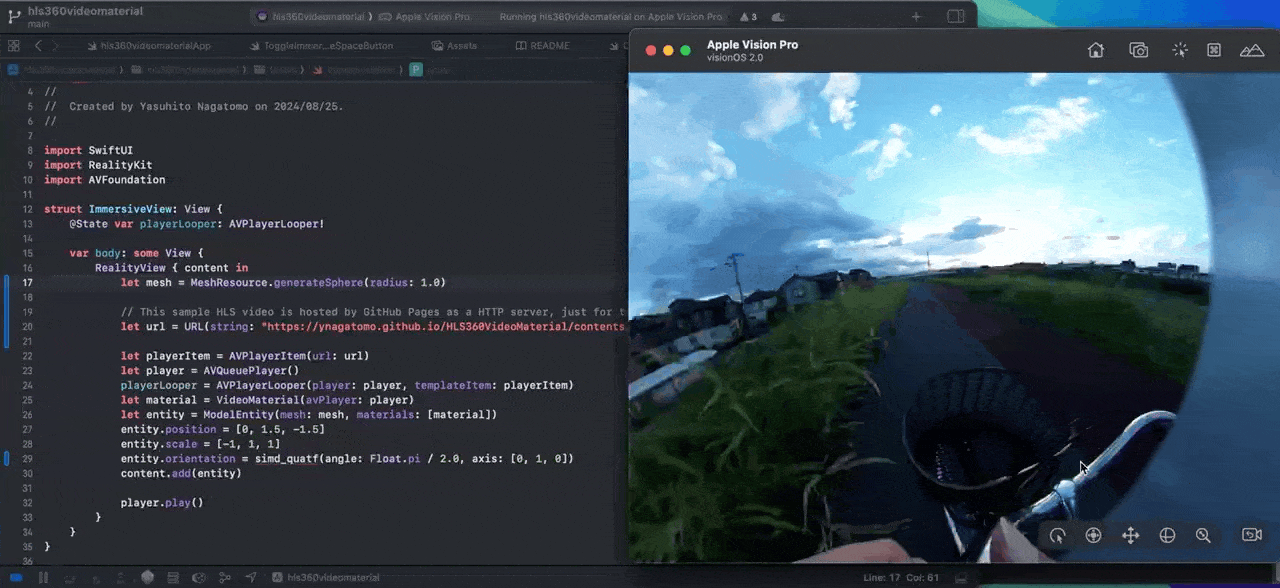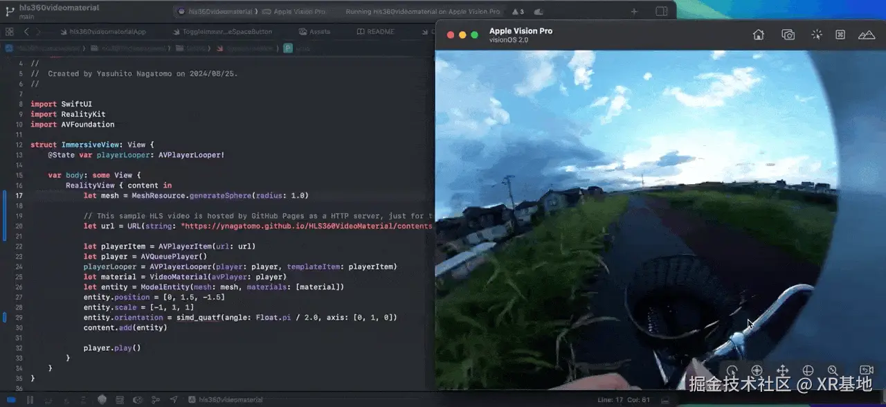 在 HLS 360 Video Material for visionOS 这个项目中,Yasuhito Nagatomo 基于 RealityKit 的 Material,实现了一个 HLS 版本的 Material,使其能够在天空球中播放 HLS 的直播视频。