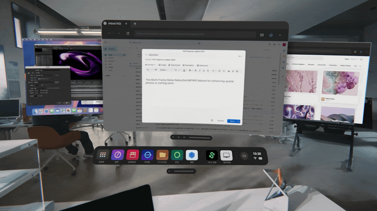 同时,此次 PICO 4 Ultra 支持将 Android 原生应用多窗口应用同时运行(包括前面看到的投屏的窗口),这在 PICO 发布会上称之为全景屏工作台,并且最多支持 20 个应用同屏,并以 360° 的形式环绕在用户眼前: