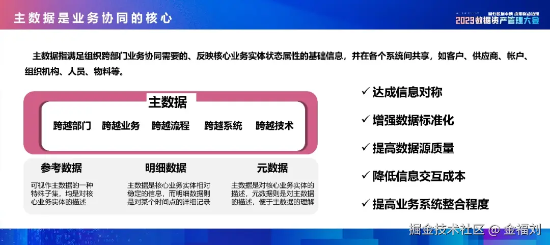 (2)跨越业务:主数据是跨越了业务界限,在多个业务领域中被广泛使用的数据,其核心属性也是来自业务;