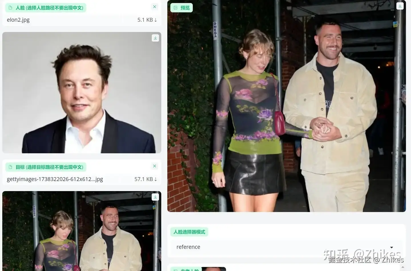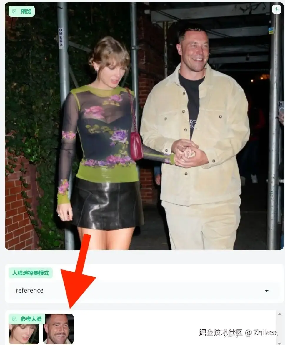 reference: 默认会替换检测到的第一张人脸,但是可以在 参考人脸 中选择替换哪一张脸,下图在 参考人脸 选择第二张脸替换马斯克的脸