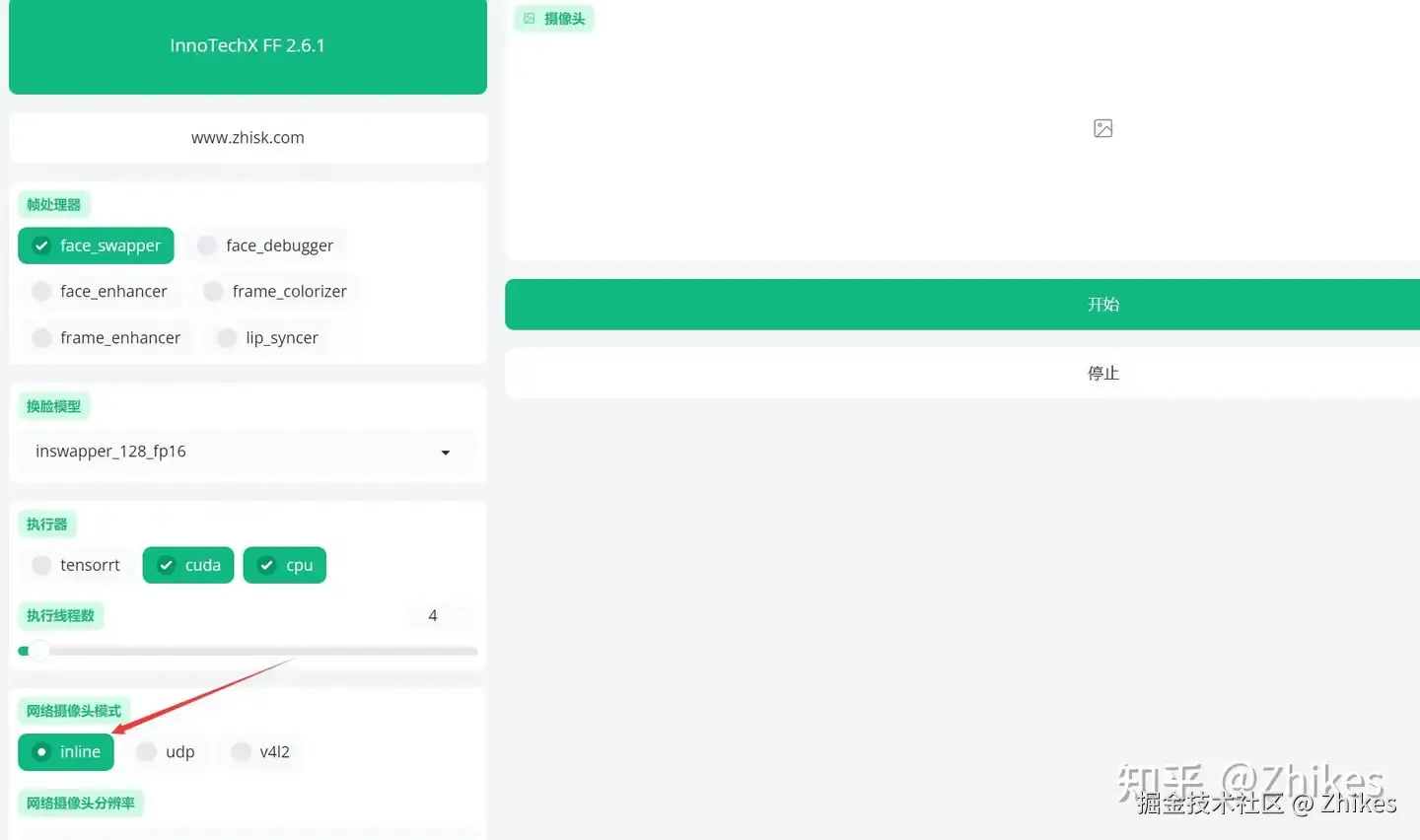 插入摄像头设备,网络摄像头模式选择inline即可,显卡不好,画面会比较卡。