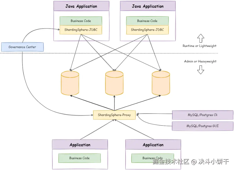 通过混合使用 ShardingSphere-JDBC 和 ShardingSphere-Proxy,并采用同一注册中心统一配置分片策略,能够灵活的搭建适用于各种场景的应用系统,使得架构师更加自由地调整适合于当前业务的最佳系统架构。