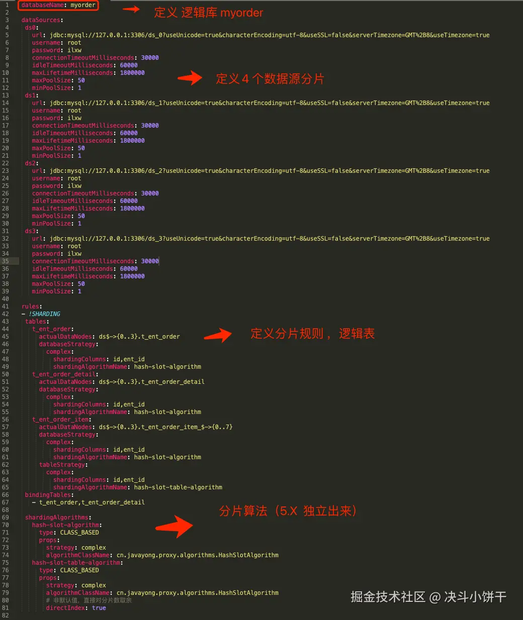 6、配置分片文件 database-myorder.yaml , 该文件用来定义订单的 4 个分片的路由策略;