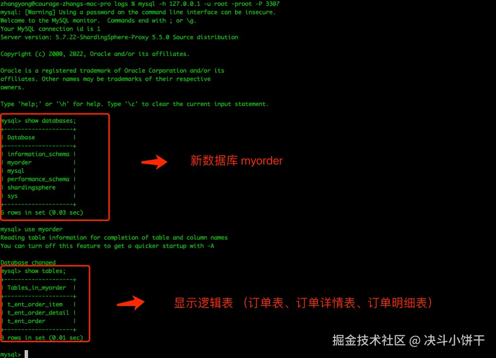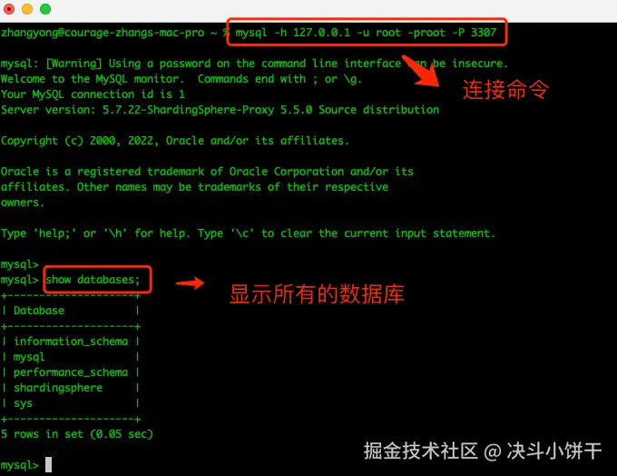 然后使用 MySQL 终端命令连接 ShardingSphere-Proxy 服务端: