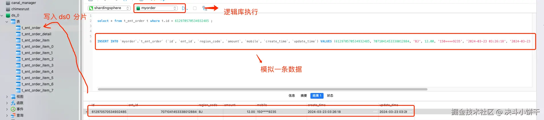 然后我们模拟在 myorder 逻辑数据库中新增一条订单记录,执行成功并且查询页正常的情况下,发现分片 ds0 中存储了刚插入的那条数据。