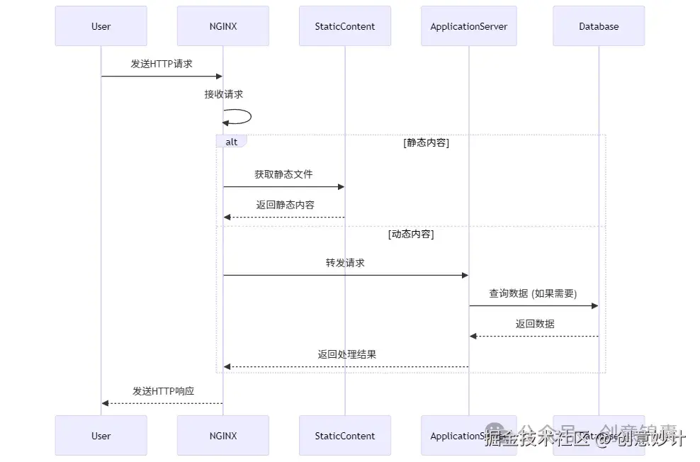 当用户在浏览器中输入网址时,客户端(用户的浏览器)会向 NGINX 服务器发送一个 HTTP 请求。NGINX 作为反向代理服务器,会根据配置文件中的规则,将请求转发给后端服务器集群中的某一台服务器。后端服务器接收到请求后,处理该请求并将结果返回给 NGINX,最后由 NGINX 将处理结果以 HTTP 响应的形式返回给客户端。客户端的浏览器收到响应后,就会将网页呈现给用户。