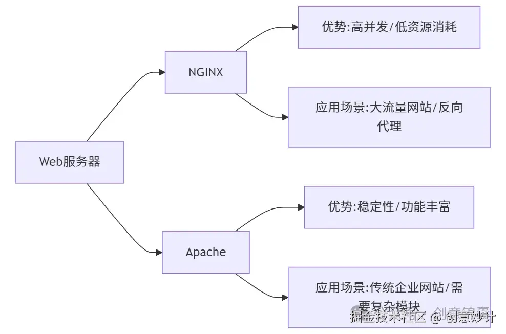 - Apache 是那种经验丰富的厨师,擅长制作各种复杂多样的菜肴(复杂的请求处理和动态内容生成)。但如果来客太多,他可能会忙不过来,需要增加更多的厨师才能应付过来(增加线程或进程)。