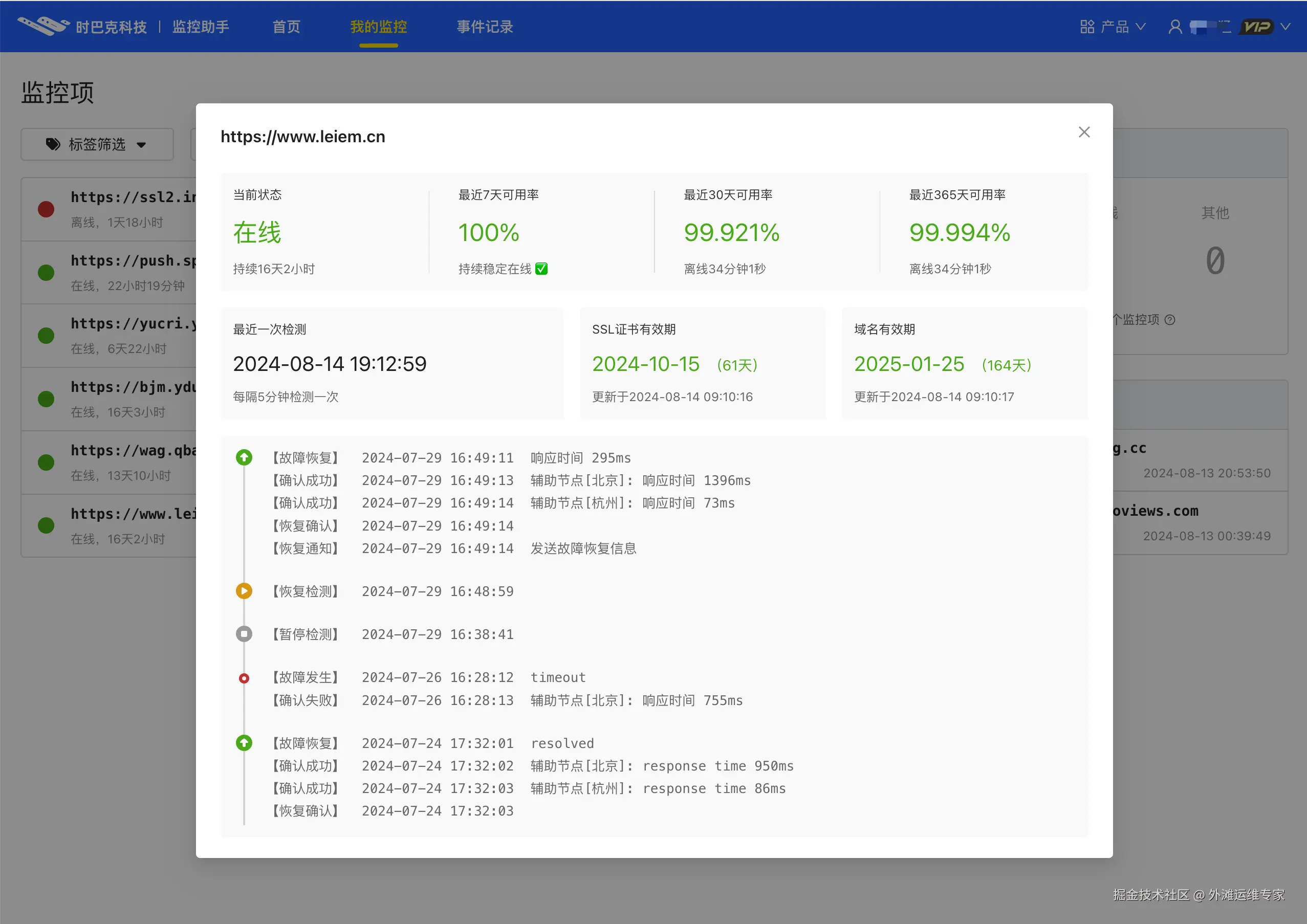 - 域名监控:监控网站域名到期时间,避免因域名过期导致的网站不可访问。