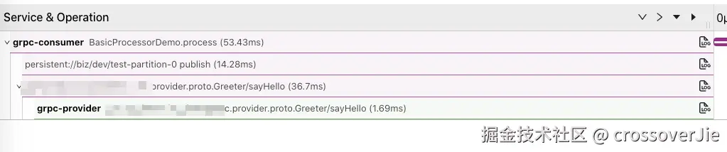 从这个链路图中可以看到 grpc-consumer 提供了调度的入口函数,然后在内部发送了 Pulsar 消息,最终又调用了 grpc-provider 的 gRPC 接口。