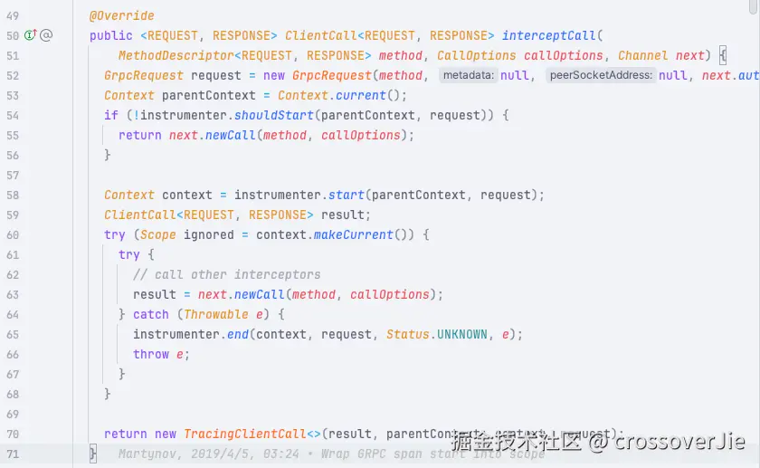 我们便可以在这些拦截中加入埋点逻辑,比如客户端的埋点代码如下 io.opentelemetry.instrumentation.grpc.v1_6.TracingClientInterceptor :
