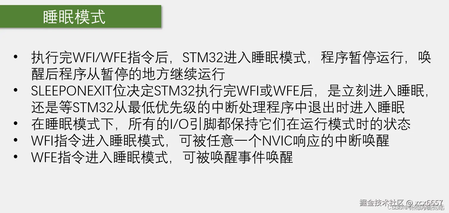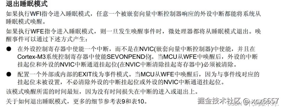 WFE,意思是wait for event等待事件,对应的唤醒条件是唤醒事件,这个事件可以是外部中断配置为事件模式,也可以是使能中断,但是没有配置NVIC。 调用WFE进入的睡眠模式,产生唤醒事件时会立刻醒来,醒来之后一般不需要进中断函数,直接从睡的地方继续运行,这是WFI和WFE的作用。