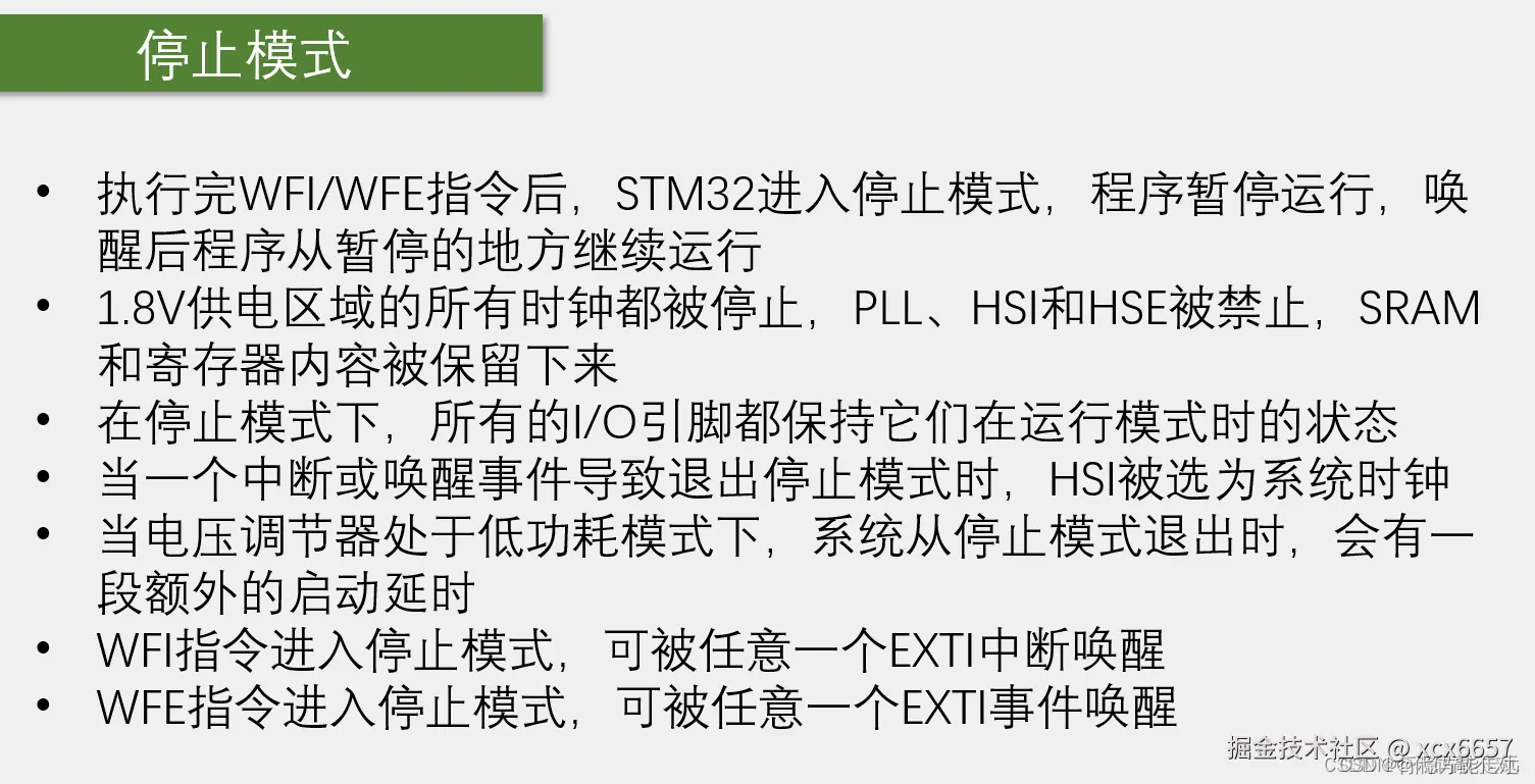 PDDS,用来区分它是停机模式,还是待机模式,PDDS等于0进入停机模式,PDDS等于1进入待机模式。 LPDS用来设置电压调节器,RPDS=0,电压调节器开启,RPDS=1,电压调节器进入低功耗模式。 最后当我们把这些位提前设置好了,最后再调用WFI或者WFE,芯片就可以进入停止模式了。
