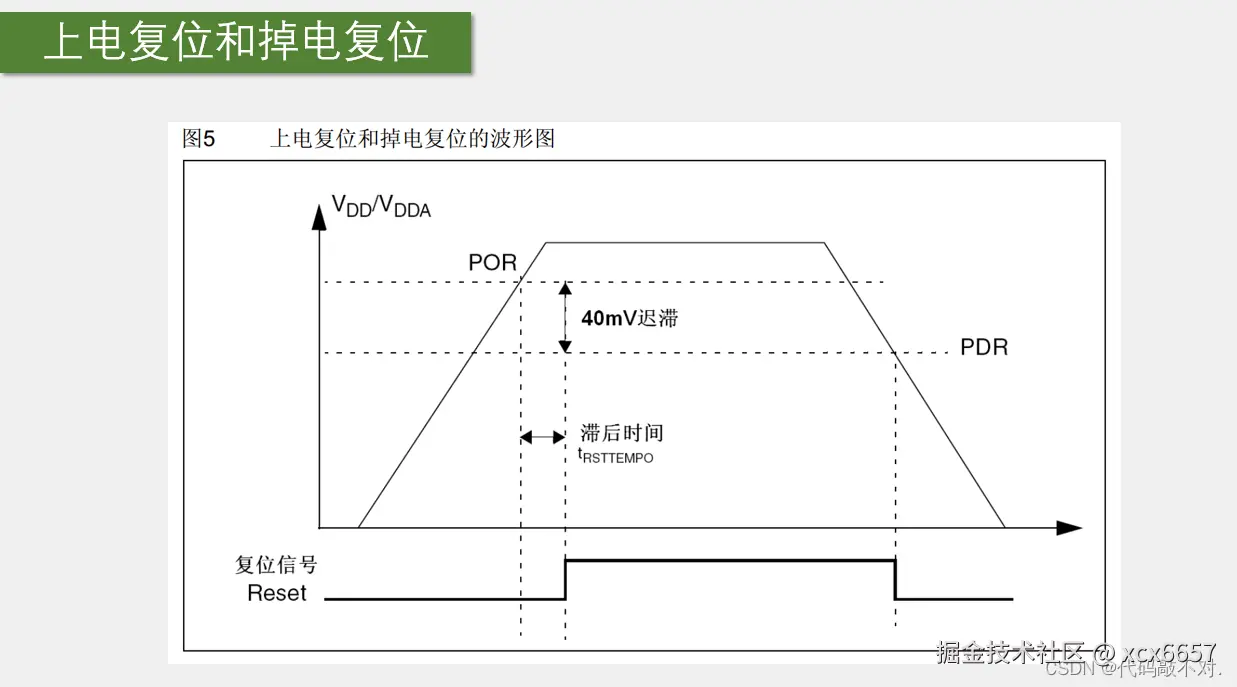 首先是上电复位和掉电复位,这个意思是当VDD或者VDDA电压过低时,内部电路直接产生复位,让STM32复位住,不要乱操作。