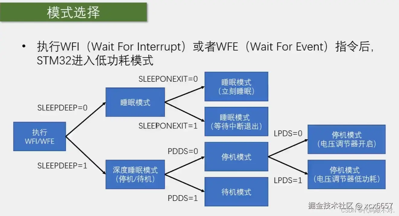 WFI/WFE区别相同点是调用任意一个之后,芯片都进入睡眠,不同点是WFI进入的得用中断唤醒,WFE进入的得用事件唤醒。