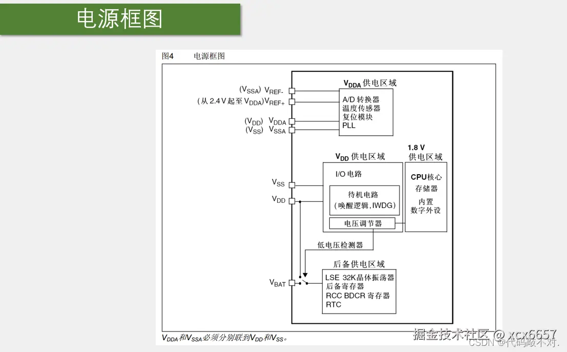 - 最下面:VBAT后备供电区域,其中包括LSE 32K晶体振荡器、后备寄存器,RCC BDCR计寄存器和RTC。 RCC BDCR是RTC的寄存器,叫做备份域控制寄存器,也是和后备区域有关的寄存器,所以也可以有VBAT供电。 低电压检测器,可以控制这个开关,VDD有电时,由VDD供电,VDD没电时,由VBAT供电。