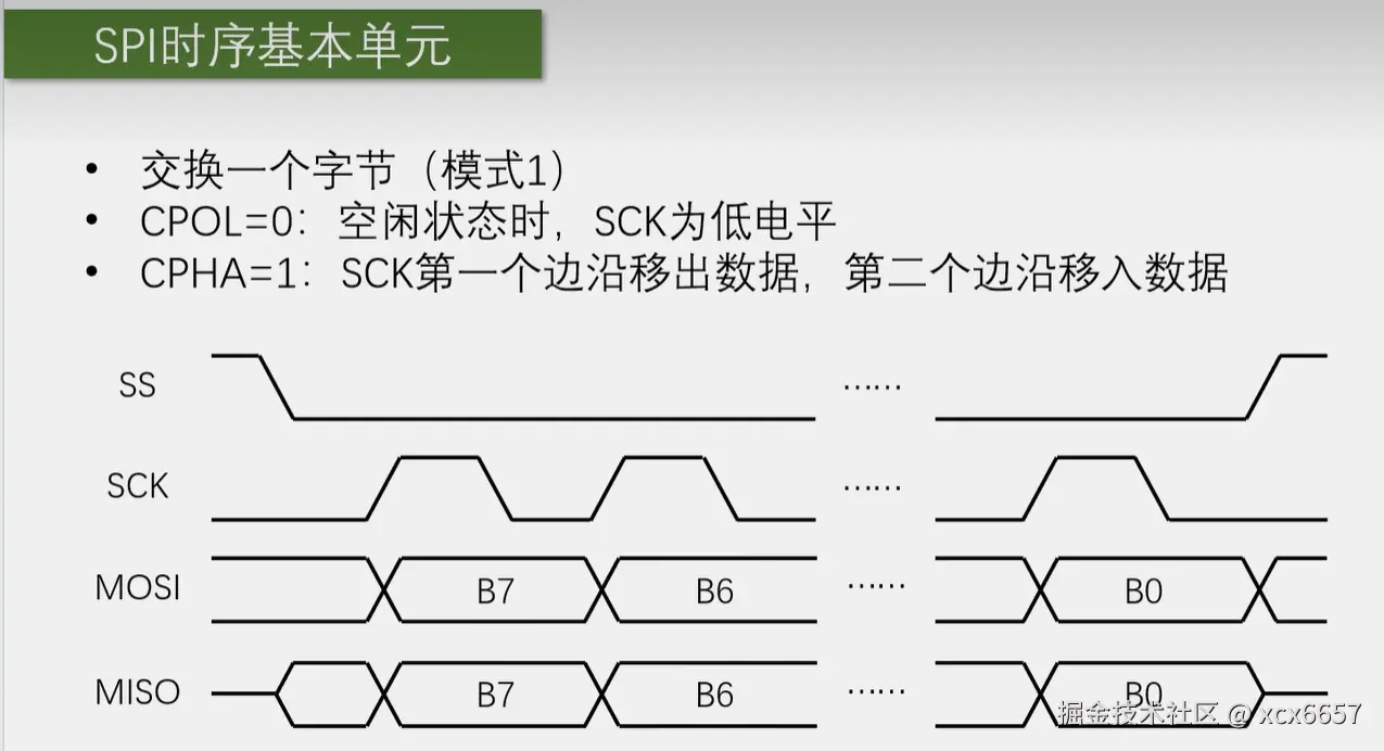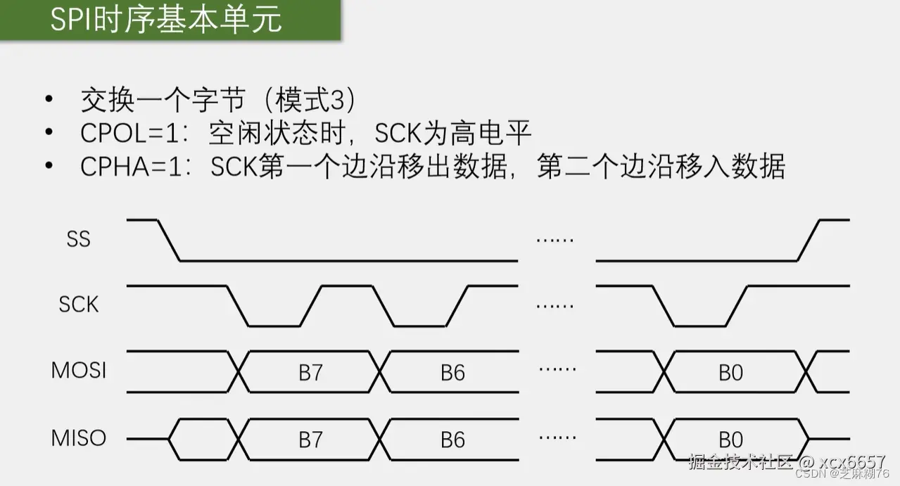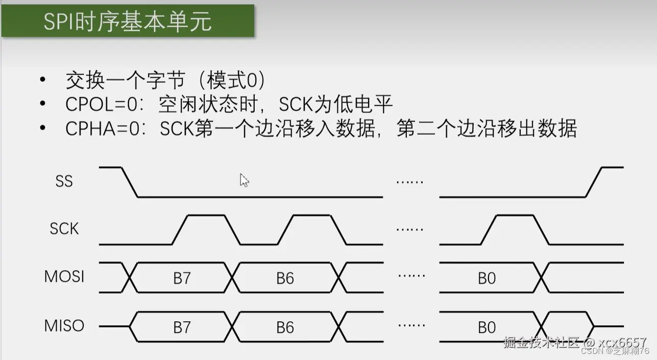 时序的基本内容是交换一个字节,CPOL=0代表空闲状态时SCK为低电平(极性为低),在SS未被选中时SCK默认低电平;CPHA=1表示SCK第一个边沿移出数据第二个边沿移入数据。 时序图中SS从机选择,通信开始之前SS为高电平,通信过程中SS始终保持低电平,通信结束SS恢复高电平