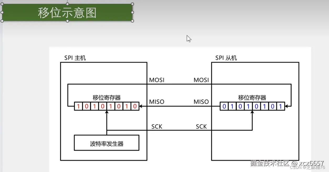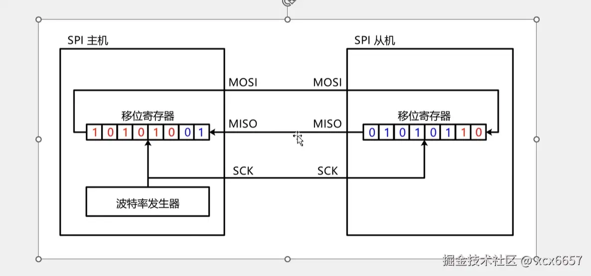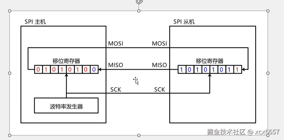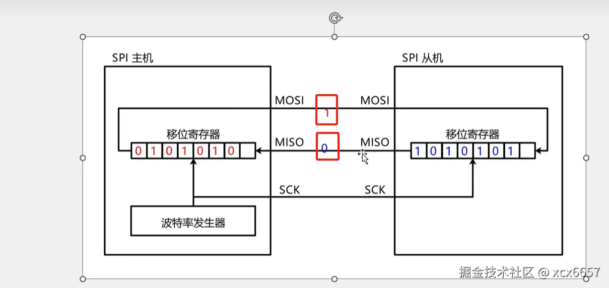 在下一个上升沿进行同样的操作,移位输出,主机现在的最高位,也就是原始数据的次高位输出到MOSI从机现在的最高位输出到MISO,随后下降沿数据采样输入