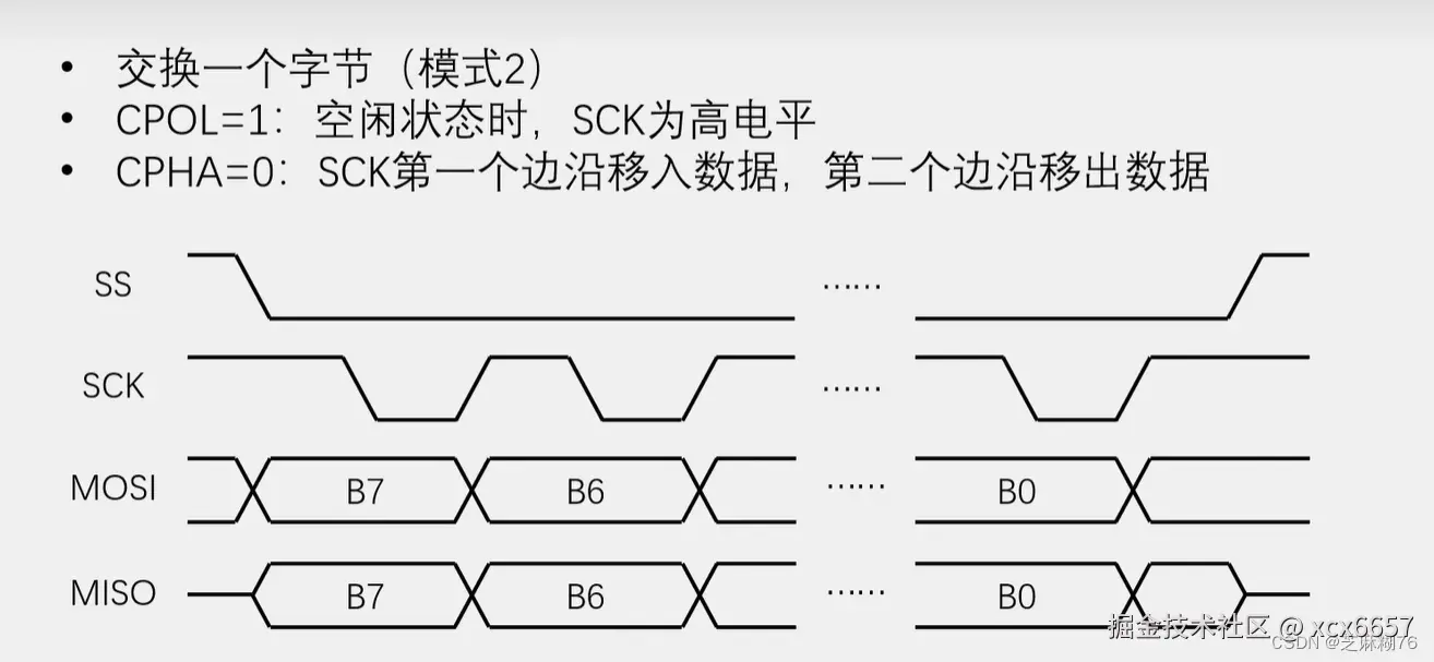 模式2与模式0的区别在于模式0的CPOL=0,模式2的CPOL=1,两者的波形就是SCK的极性取反,剩下的流程完全一致