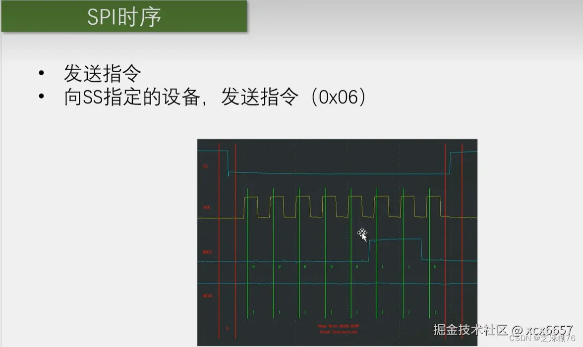 整个时序的功能是发送指令,指令码是0x06,从机一比对事先定义好的指令集,发现0x06是写使能的指令,从机就会控制硬件写使能,完成一个指令从发送到执行的过程