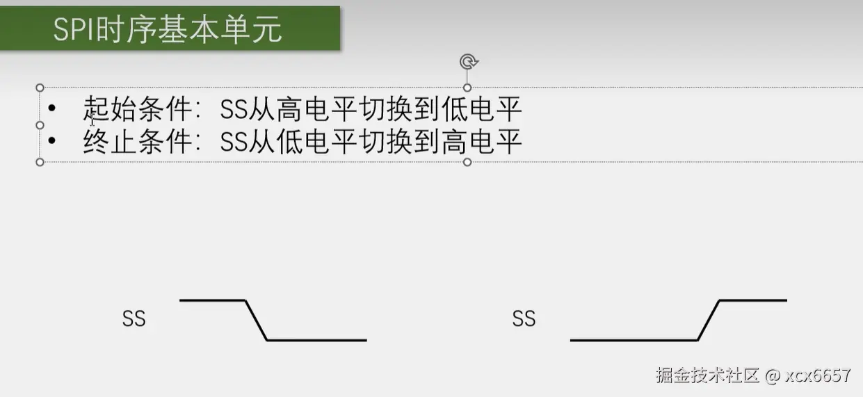 SS从高电平切换到低电平,是左边的图,SS是低电平有效,SS从高变到低代表着选中了某一个从机,也是通信的开始 - 终止条件: