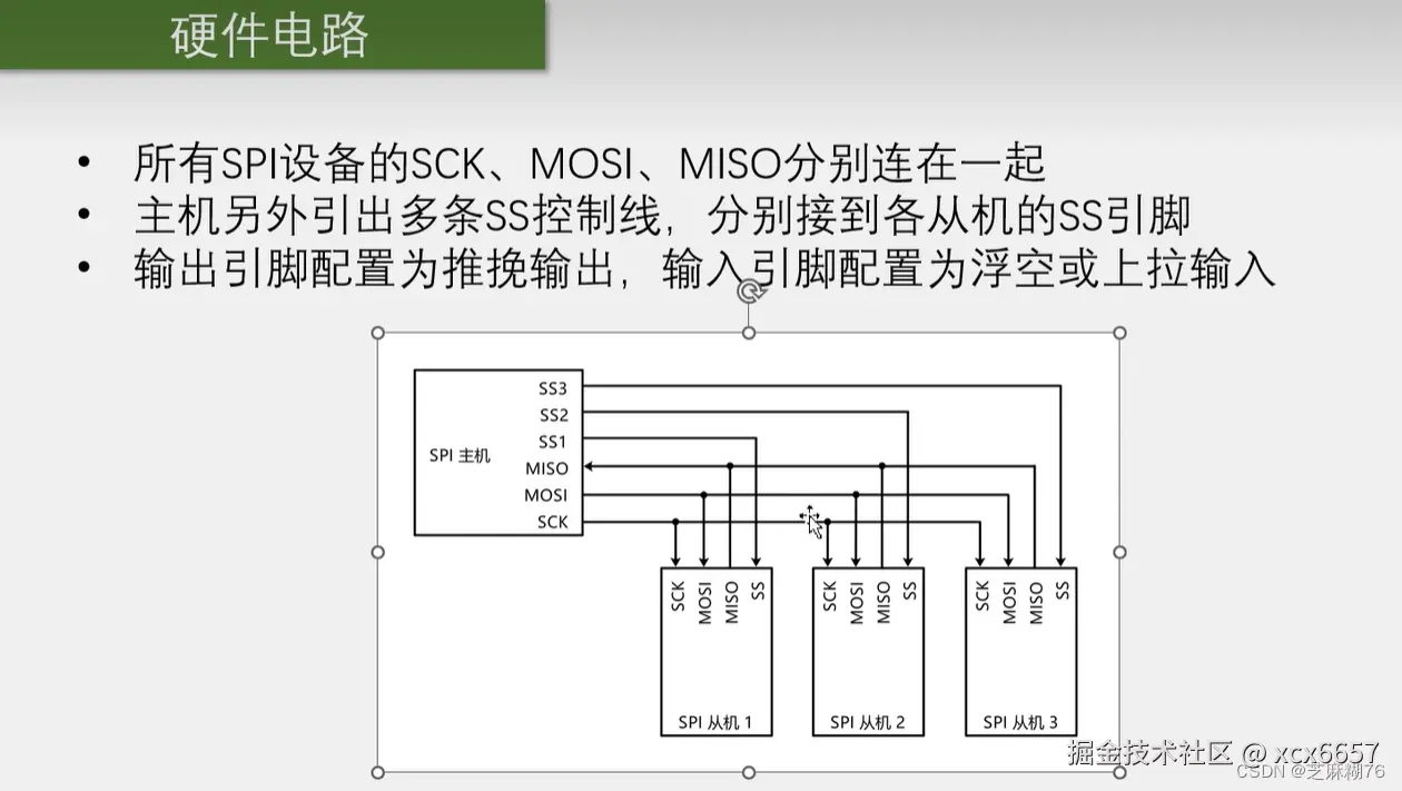 输出引脚配置为推挽输出,因为推挽输出在高低电平均具有较强的驱动能力,这将是的SPI引脚信号的下降沿非常迅速,上升沿也非常迅速,不像IIC下降沿迅速上升沿缓慢。得益于推挽输出的驱动能力,SPI信号变化的快,能达到更高的传输速度(MHz级别)。(响应速度的快的原因之一)