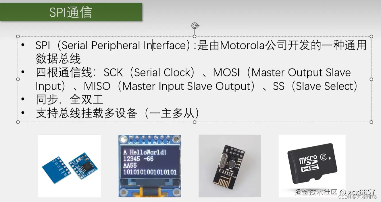 SPI有四根通信线,分别是SCK(serial CLOCK串行时钟线)、MOSI(master output slave input主机输出从机输入)、MISO(master input slave output主机输入从机输出)、SS(slave select从机选择)