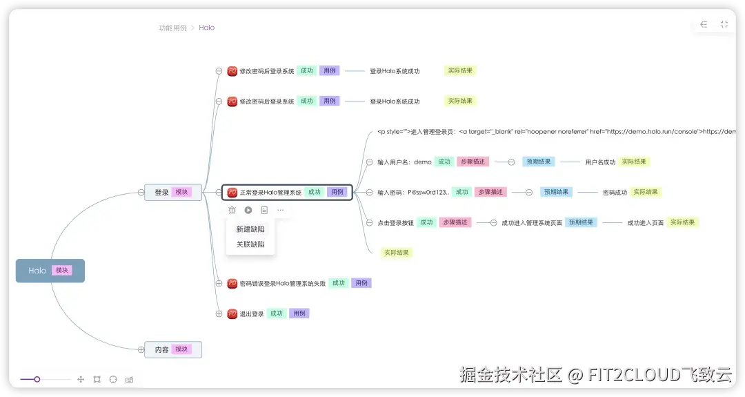 在MeterSphere v3.2.0版本中,“测试计划”模块支持使用思维导图模式快捷执行功能用例。同时,在执行用例的过程中,用户还可以快速新建缺陷或关联缺陷。