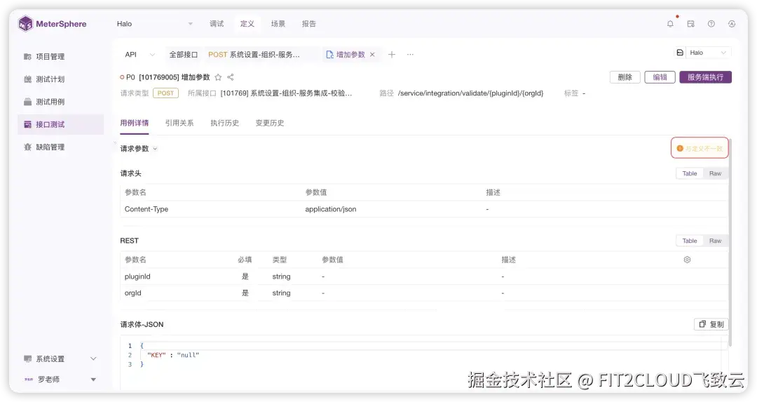 在进入“用例详情”页面或者编辑接口用例时,MeterSphere会实时与接口定义的请求参数进行对比。当出现“与定义不一致”的提示链接时,点击该提示链接,即可再次进入“接口与用例差异对比”页面,用户可以在“接口与用例差异对比”页面进行同步操作。