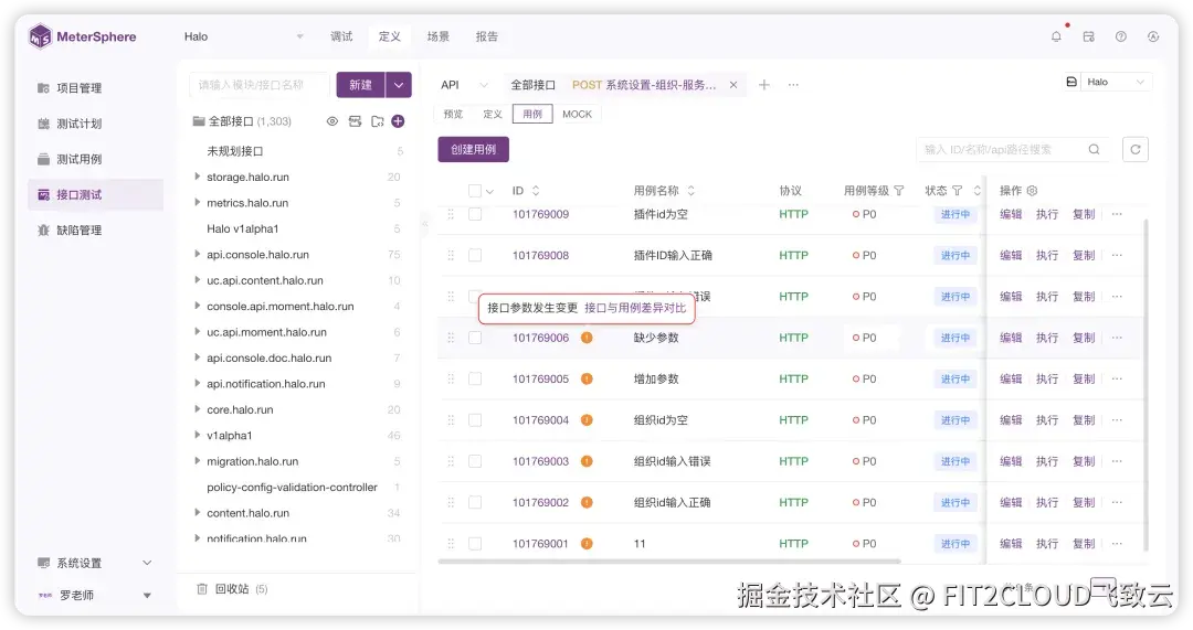 当接口请求参数发生变更(例如IDEA插件同步变更、文件导入变更和手动变更等)后,MeterSphere会自动在接口用例列表中推送变更提醒,用户除了可以接收到API变更的消息通知外,在进入用例列表页面时也能够立刻获取变更提醒。