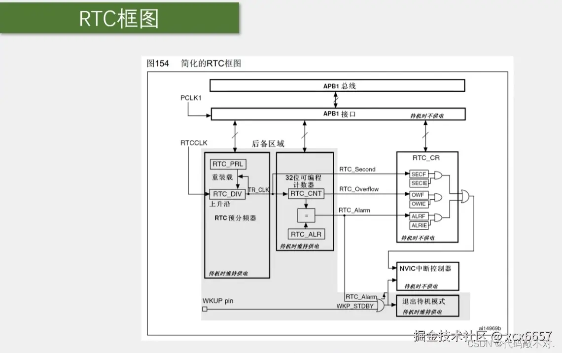 APB1总线和APB1接口,就是程序读写寄存器的地方,读写寄存器可以通过APB1总线来完成。另外,RTC是APB1总线上的设备。