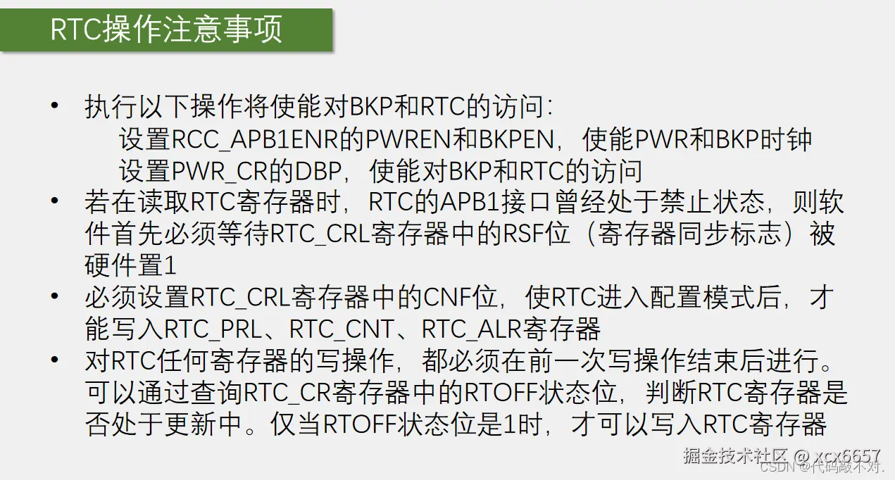 第二条:这一步对应代码里的一个库函数就是RTC等待同步,一般在刚上电的时候调用一下这个函数就可以。要求我们在APB1总线刚开机时,要等一下RTCCLK,只要RTCCLK来一个上升沿,RTC把它的寄存器的值同步到APB1总线上,这样之后读取的值就都是没问题的了,这是设计细节的一个问题,只需要在初始化时调用一个等待同步的函数就行了。