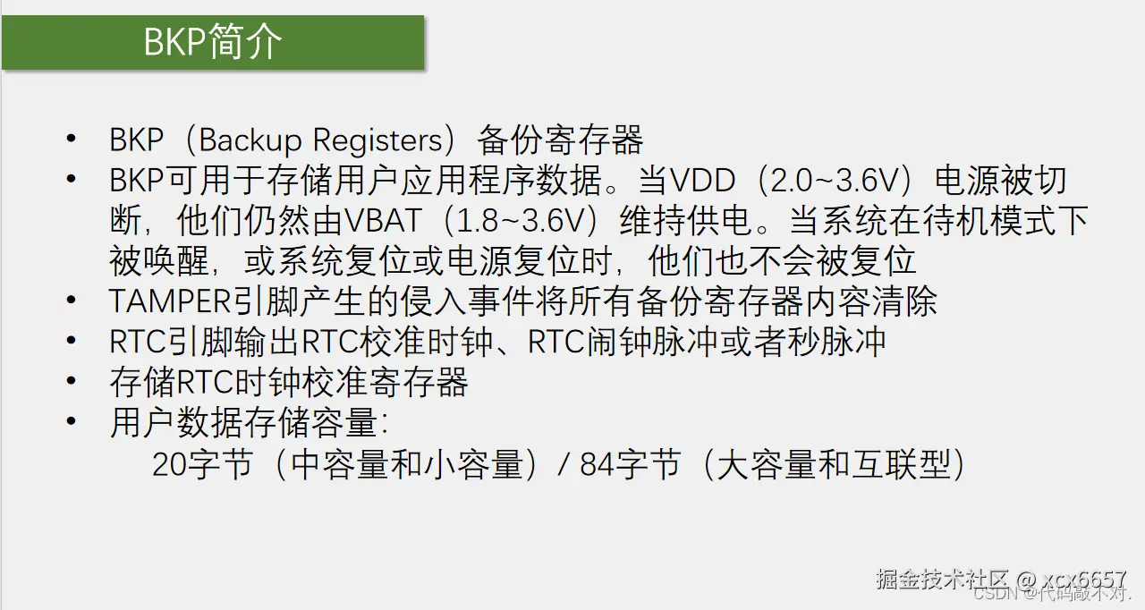 - 这个图中橙色部分我们可以叫做后备区域,BKP处于后备区域,但后备区域不只有BKP,还有RTC的相关电路也位于后备区域。