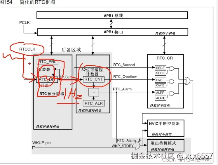 然后右边有三个信号可以触发中断,分别是秒信号、计数器溢出信号和闹钟信号,三个信号先通过中断输出控制进行中断使能,使能的中断才能通向NVIC,然后向CPU申请中断。