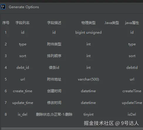 最后的效果就是这样,获取到对应的字段名,字段描述,字段类型等